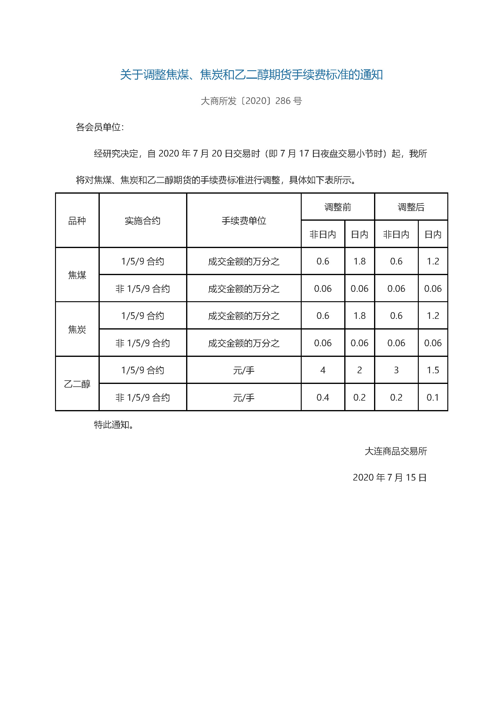 【交易所通知】关于调整焦煤、焦炭和乙二醇期货手续费标准的通知