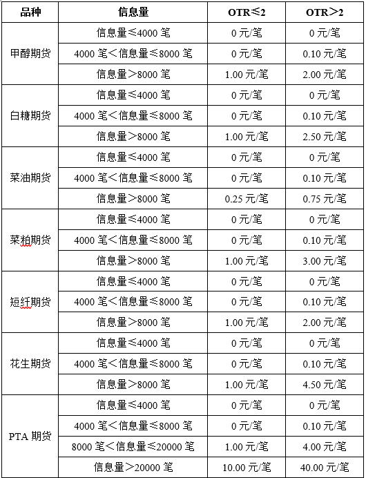 根据《郑州商品交易所期货结算细则》第二十七条规定,经研究决定,自2022年8月4日当晚夜盘交易时起,对甲醇、白糖、菜油、菜粕、短纤、花生期货合约交易收取申报费,并对PTA期货合约申报费收费标准进行调整,具体如下: