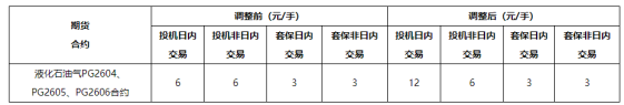 经研究决定,自2026年3月25日交易时(即3月24日夜盘交易小节时)起,对液化石油气期货品种合约手续费进行调整,具体如下: