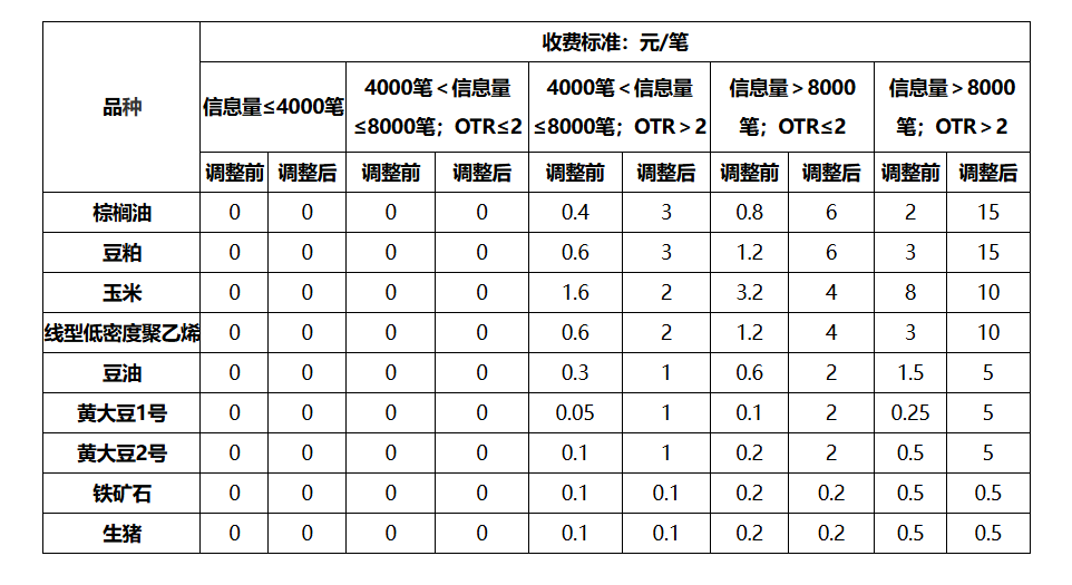 经研究决定,自2024年6月3日交易时(即5月31日晚夜盘)起调整棕榈油、豆粕、豆油、黄大豆1号、黄大豆2号、玉米、线型低密度聚乙烯期货合约的申报费收费标准,申报费收取方式及其余期货合约申报费收费标准等维持不变。