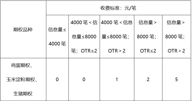 自2024年10月25日交易时(即10月24日晚夜盘)起对鸡蛋、玉米淀粉和生猪期权合约收取申报费,适用对象及收费标准与我所已上市期权品种一致(见下表)。申报费按日收取,期权合约申报费按合约月份统计。