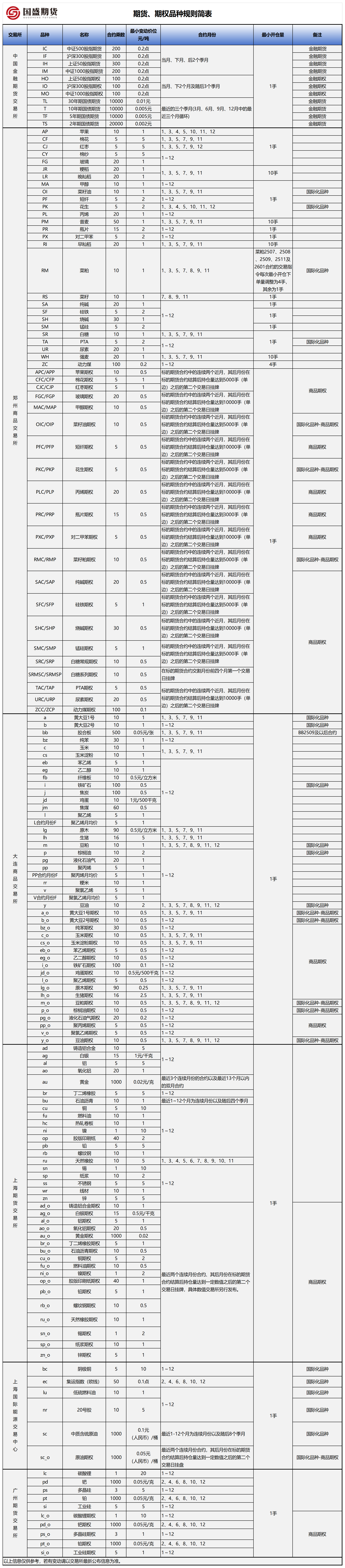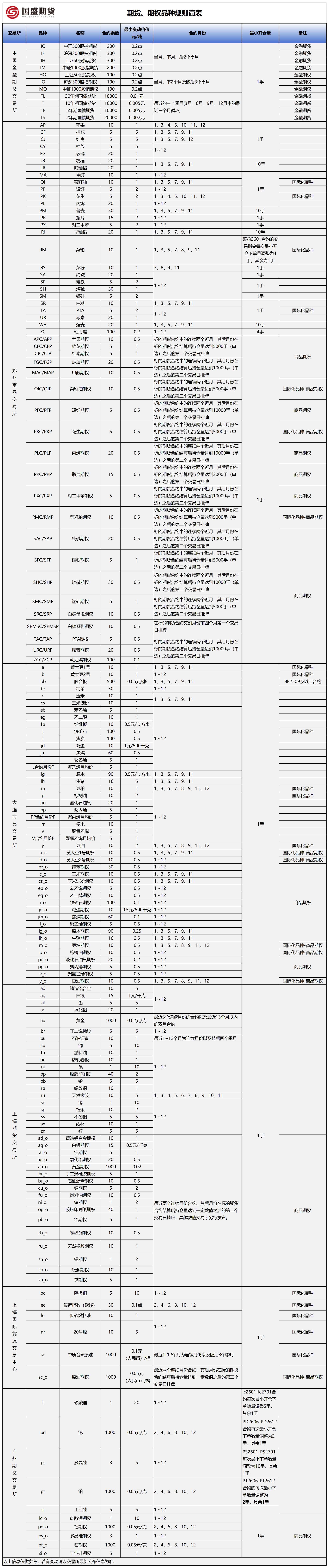 期货期权品种规则简表