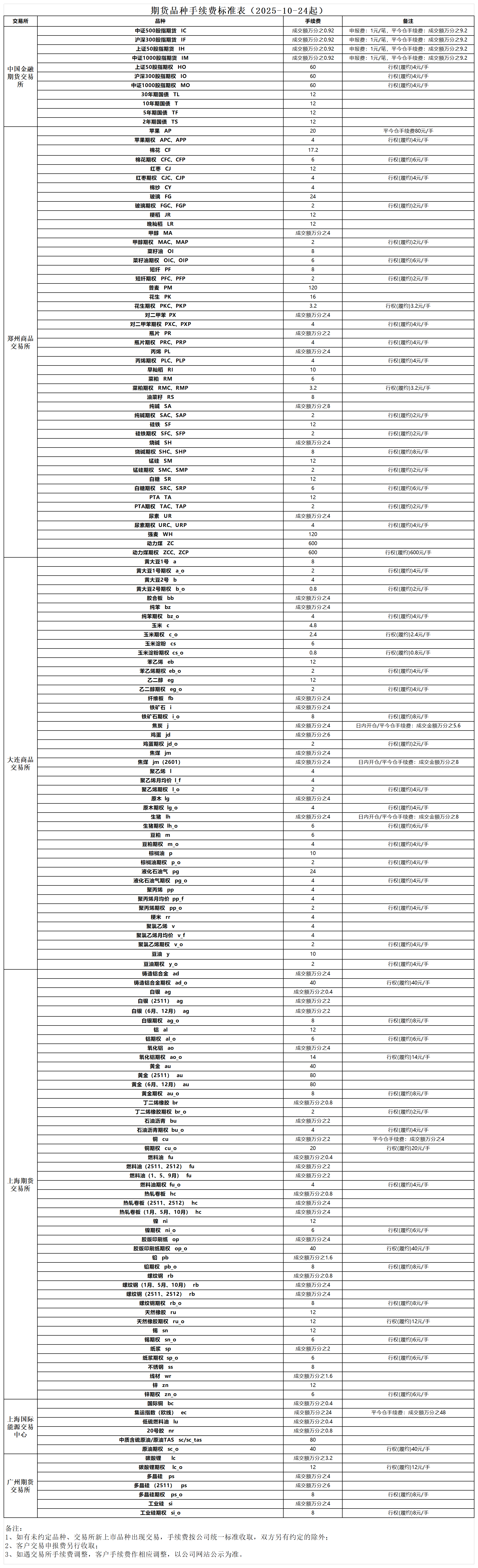 期货品种手续费标准表