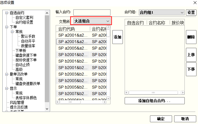 1)选择系统菜单栏上【选项】的【选项设置】的【交易所】选择【大连组合】【郑州组合】,再选择需要交易的交易所标准组合,点击右边的【添加】按钮,添加到【自选合约】