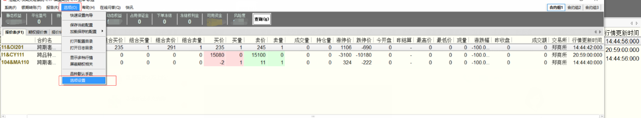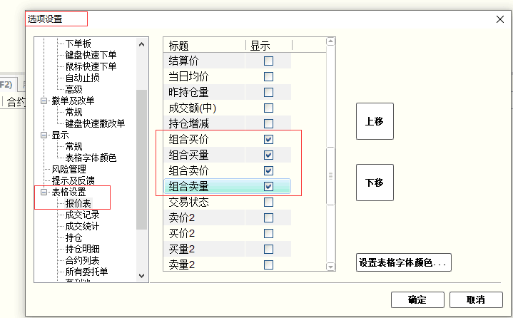 2)选择系统菜单栏上【选项】的【选项设置】的【表格设置】选择【报价表】中勾选【组合买价】【组合买量】【组合卖价】【组合卖量】