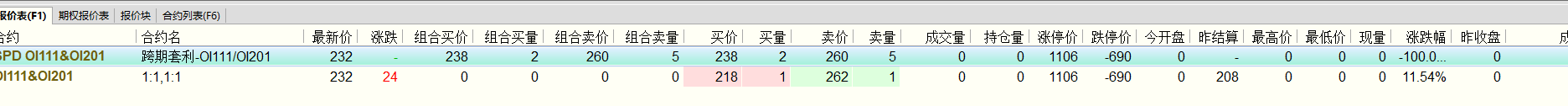 3)在【报价表】中选择【组合买价】【组合买量】【组合卖价】【组合卖量】查看标准组合交易所报价情况(备注:标准组合的买价/买量/卖价/卖量并不是交易所报价)